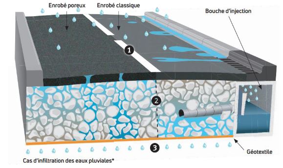 Une structure réservoir avec enrobé classique imperméable et bouches d’injection représente environ 120 €/m2 ;
