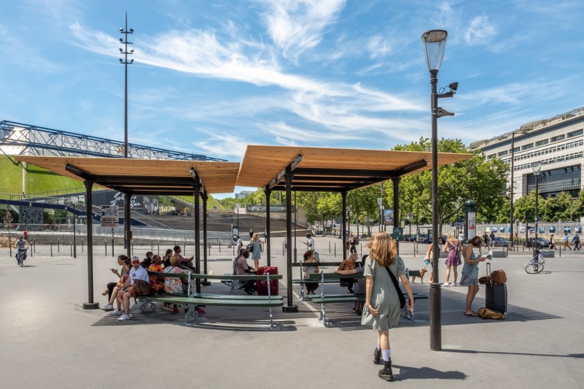 Comme nous l’indique Marie Rouaux, responsable du Plan Paris Frais à la Ville, les ombrières ont été particulièrement appréciées sur les places très minérales, où les gens se retrouvent, comme sur la place du Bataillon du Pacifique, proche de la station de métro Bercy, ou le parvis de la Mairie du 14e, proche d’un square et d’un lycée.