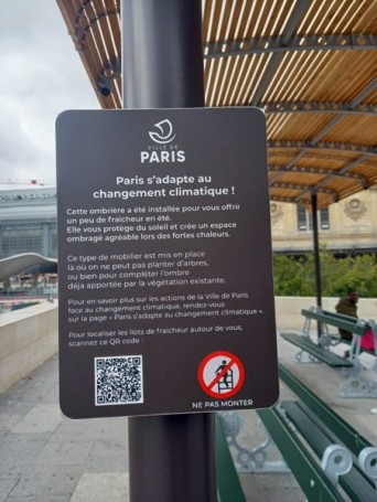 Installer des panneaux explicatifs peut également favoriser l’acceptation du dispositif, notamment lorsque les habitants s’interrogent sur la présence d’une ombrière plutôt que d’un arbre.
