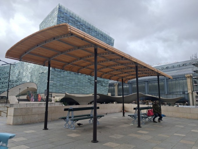 Ces ombrières ont été construites et testées à l’été 2022 et réinstallées en 2023 et 2024 sur des places plus sollicitées. La Direction des Constructions Publiques et de l’Architecture a également conçu et fabriqué cinq ombrières tout en bois, plus petites et plus légères.