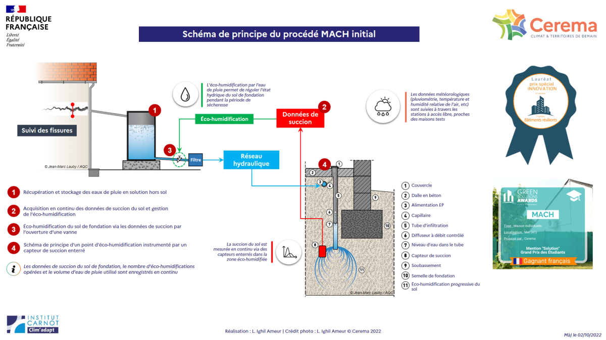 Pour ce faire, le Cerema a développé un dispositif qui permet une réhumidification contrôlée du sol à proximité des fondations. Le principe repose sur la récupération des eaux de pluie qui sont stockées puis injectées manuellement (MACH) et à l’avenir automatiquement (MACH+) autour des fondations, lorsque les capteurs de succion du sol détectent des variations importantes. D’abord expérimenté sur une maison, l’objectif du Cerema est d’étendre et commercialiser la solution.