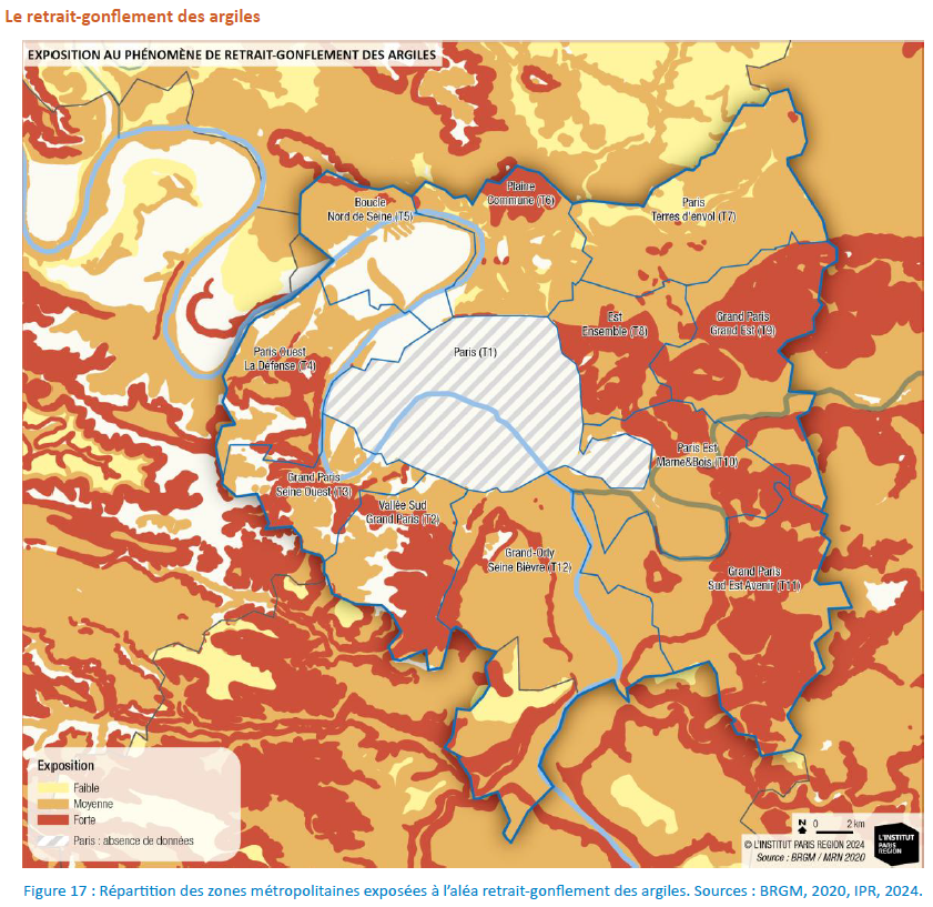 D’après son diagnostic de vulnérabilité, 92 % de son territoire – hors Paris – est exposé au phénomène de RGA, dont 89,4 % se trouve en zone d’exposition moyenne à forte (Plan Climat-Air-Énergie Métropolitain, page 169).