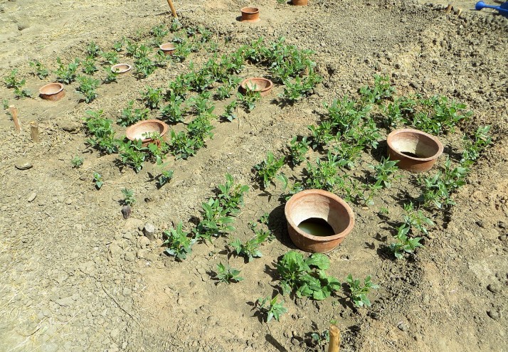 Ainsi, les racines se développent autour de l’oya, dans le sol humide et sur la surface de la jarre. La diffusion d’eau fonctionne par capillarité, ainsi elle ne se vide pas si le sol est humide et que les plantes n’absorbent pas l’eau.