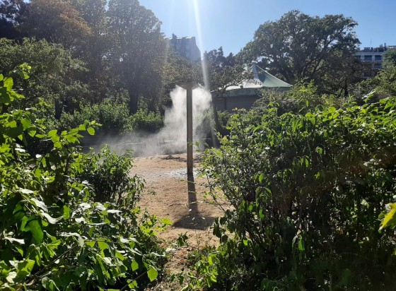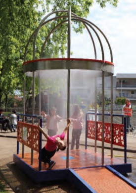 Dans le cadre de l’adaptation des villes aux fortes chaleurs, l’utilisation de brumisateurs se démocratise dans les espaces publics. S’intégrant au paysage urbain, ces aménagements permettent à la population et notamment aux plus vulnérables de se rafraîchir, en abaissant la température de l’air ainsi que la température ressentie, par la diffusion de fines gouttelettes d’eau sous forme de brume diffusées généralement par jet à haute pression.