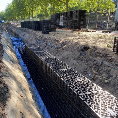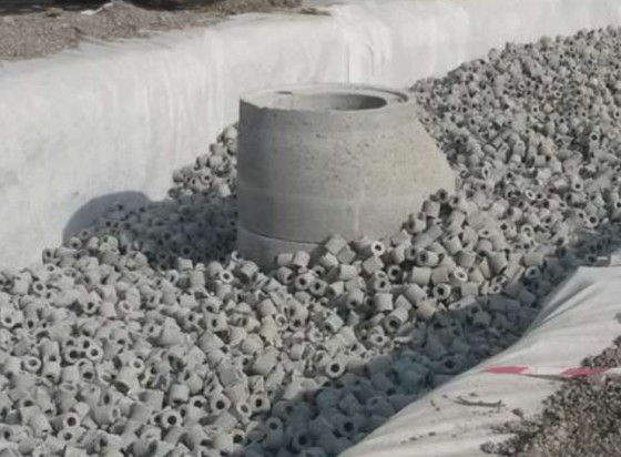 D’autres matériaux alternatifs comme les modules creux en béton peuvent également être déployés. Ces derniers ne sont pas poreux, mais leur géométrie leur permet d’absorber, stocker et restituer l’eau sans risque de colmatage. L’indice de vide est de l’ordre de 60 %.
