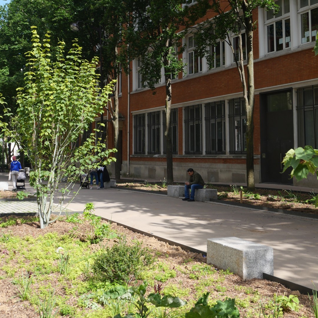 Du côté de la façade de l’école, les arbres ont été conservés et des bandes végétalisées ont été créées entre les arbres.