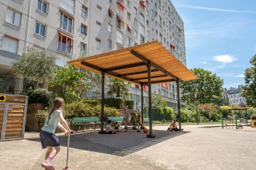 Dans le cadre du programme « Paris Frais », la Ville de Paris a mené pendant l’été une expérimentation d’un modèle d’ombrière en bois, conçu et fabriqué par ses services, afin de mesurer scientifiquement l’efficacité thermique et d’évaluer leur appropriation par les usager·ères. Au total, six ombrières ont été déployées, dans le 12e arrondissement, en variant les typologies d’espaces : une cour d’école, une pelouse d’un jardin, une aire de jeu d’un square, un espace autour d’une fontaine et une place.