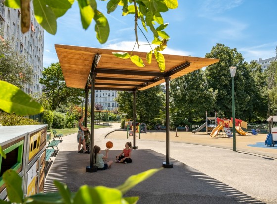 Ces ombrières ont été construites et testées à l’été 2022 et réinstallées en 2023 et 2024 sur des places plus sollicitées. La Direction des Constructions Publiques et de l’Architecture a également conçu et fabriqué cinq ombrières tout en bois, plus petites et plus légères.