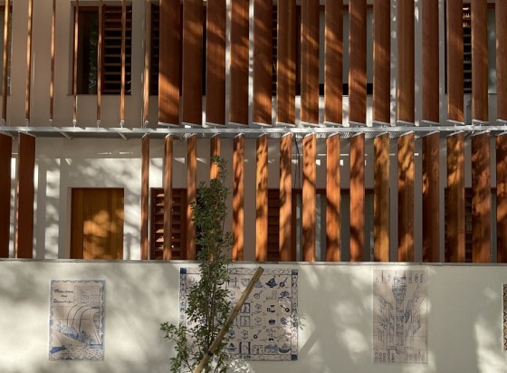 L’ensemble du bois utilisé pour cette rénovation est non traité et issu de forêts locales. Pour les brise-soleil fixes, le bois utilisé témoigne d’une traçabilité exceptionnelle : il provient d’une petite exploitation où les arbres ont été sélectionnés avec l’exploitant et où le bois est débusqué de la forêt à l’aide de chevaux de trait pour réduire l’empreinte de cette opération.