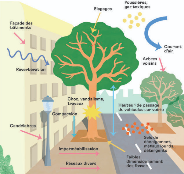 Quand on compare les arbres des villes avec ceux qui évoluent dans des milieux naturels, on observe qu'ils sont plus vulnérables et ont une mortalité accrue. Cela est dû aux nombreuses contraintes que le milieu urbain présente :