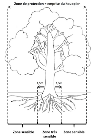Le système racinaire (sensible à la compaction causée par les engins de chantier et le stockage de matériaux, ainsi qu'à la destruction de racines et radicelles lors de travaux de terrassement et excavation)