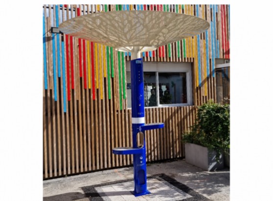 - Un module d’ombrage consistant en une ombrière surplombant le « mât » de la fontaine et culminant à 2,7 mètres du sol. L’ombrière est composée d’une structure micro perforée pour limiter l’emprise au vent, en forme de feuillage. L’ombre projetée au sol peut atteindre jusqu’à 7 mètres.